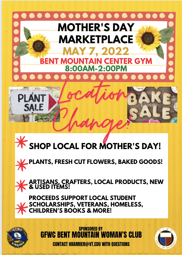 GFWC Bent Mtn Womens Club Yard Sale Saturday, May 7, 2022 8:00 AM 2:00 PM Bent Mountain Center 10148 Tinsley lane Bent Mountain, VA, 24059 United States (map) Google Calendar ICS
