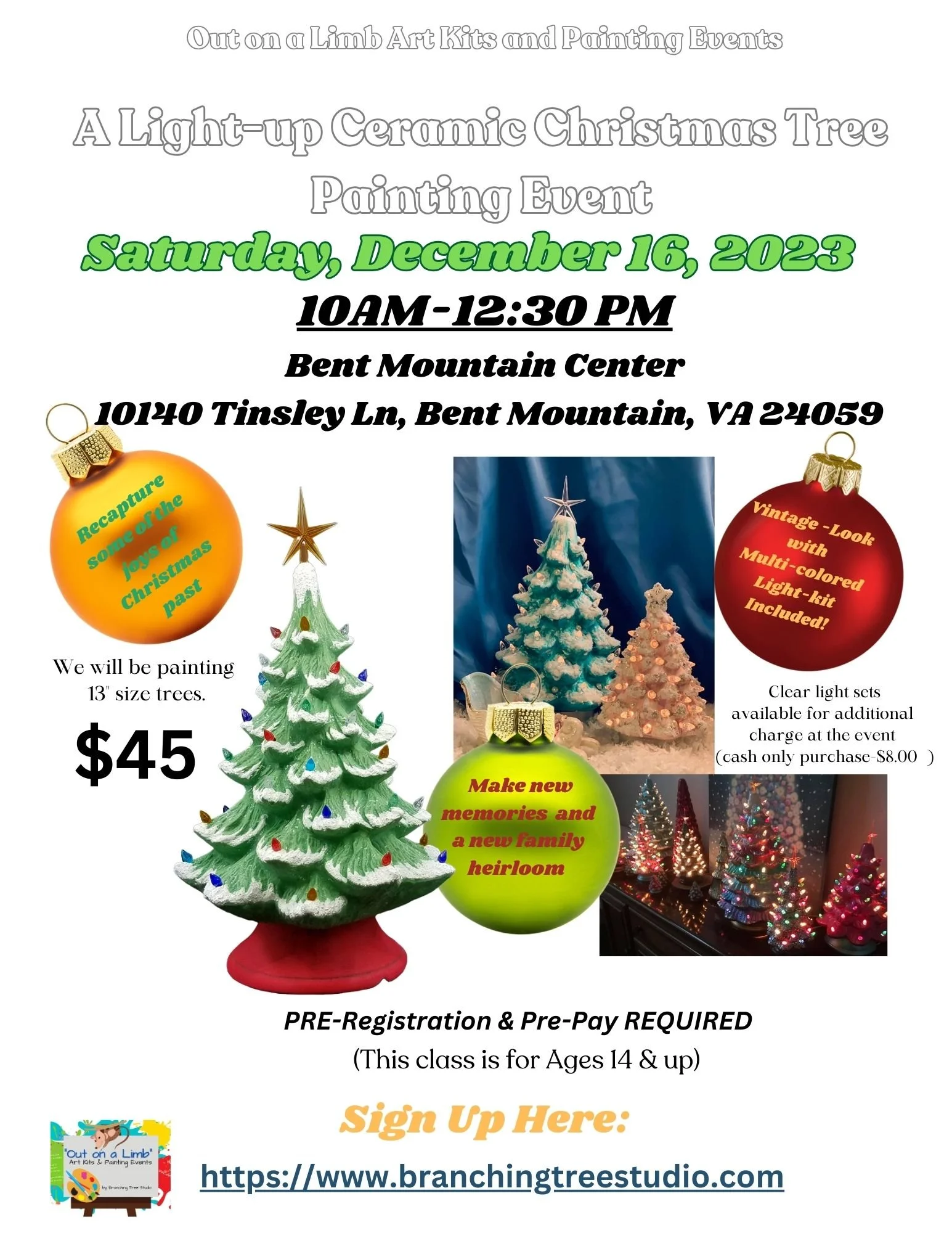 Back to All Events Ceramic Christmas Tree Saturday, December 16, 2023 10:00 AM 12:30 PM Bent Mountain Center 10148 Tinsley Lane Bent Mountain, VA, 24059 United States (map) Google Calendar ICS Ceramic Christmas Tree Paint Party Sign up Link